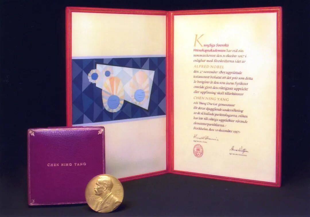 1957年杨振宁自瑞典国王手中接受诺贝尔奖章(上)、诺贝尔奖章与奖状(下)(图片来源:清华大学)