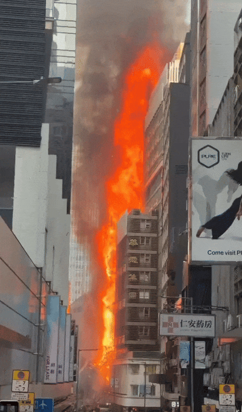 今天(18日)下午4点左右,香港中环干诺道中34-37号华懋大厦后巷, 一大楼外棚架起火,火乘风势直攻而上, 大厦陷入火海,浓烟席卷半空,一度传出爆炸声。