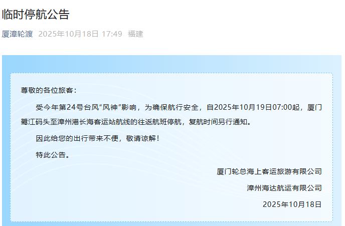 厦漳轮渡发布停航公告