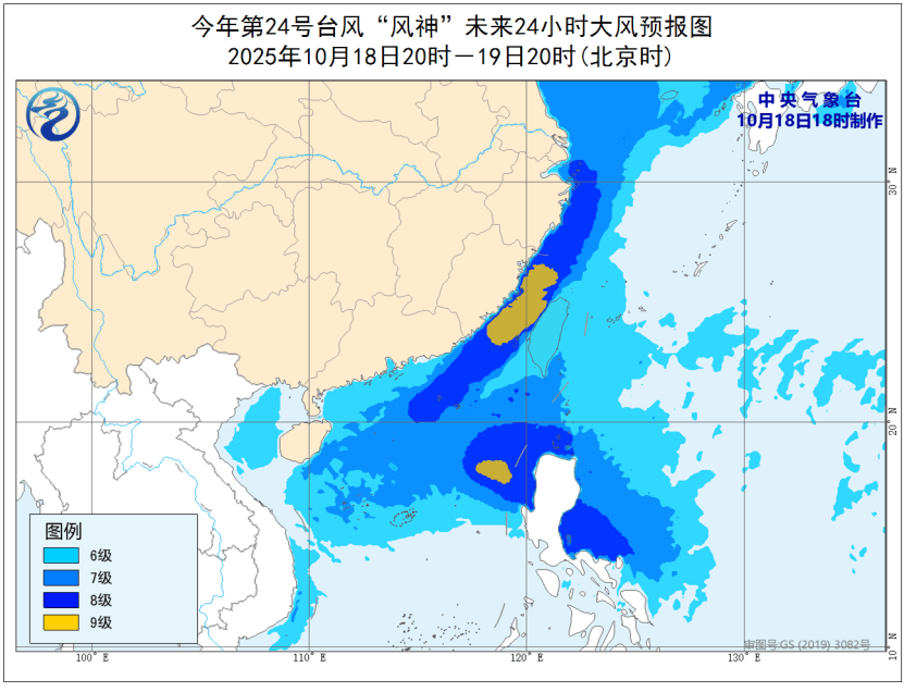 大风预报:受冷空气和“风神”的共同影响,18日20时至19日20时,台湾以东洋面、台湾海峡、巴士海峡、南海北部和中部、西沙群岛和中沙群岛附近海域、北部湾、台湾沿海、福建沿海、广东沿海、海南岛东部沿海将有6级—8级大风、阵风9级—10级,其中台湾海峡、台湾西部沿海、福建沿海和南海中部偏东海域风力有9级、阵风10级—11级。