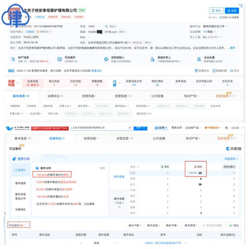 记者调查发现,涉事月子中心“北京子悦安享母婴护理有限公司”已被列入经营异常名录,该公司涉及40起司法案件。月子中心负责人刘总表示,愿出庭证明月子中心与酒店之间存在合同关系。