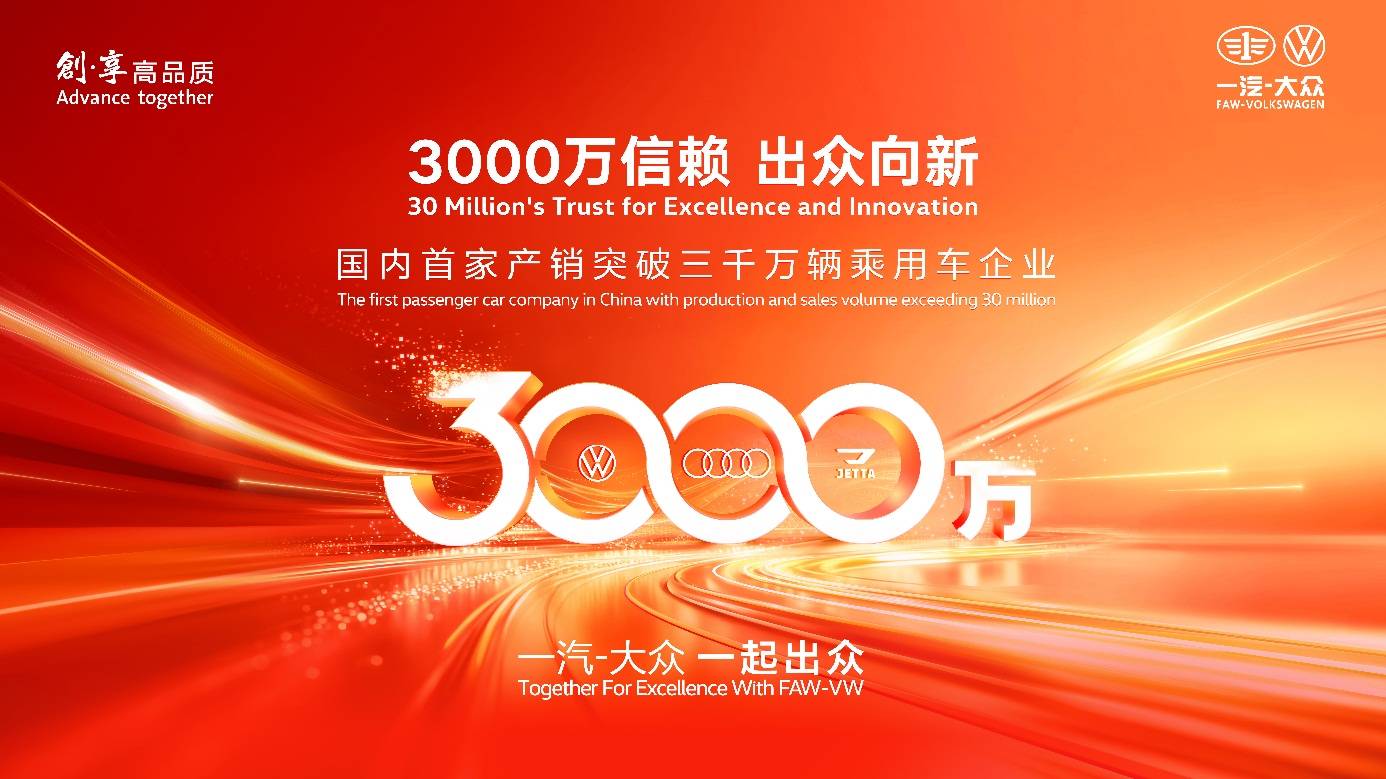 站在3000万辆的新起点,一汽-大众将继续以技术创新为驱动,以客户需求为中心,加速向电动化、数字化、智能化转型,携手全体员工、合作伙伴与社会各界,奔赴下一段更加辽阔的征途,以卓越商品和至诚服务,持续引领中国汽车行业高质量发展,让“一汽-大众”不仅是一个品牌,更成为中国制造的金字招牌和亿万客户的智慧出行伙伴。
