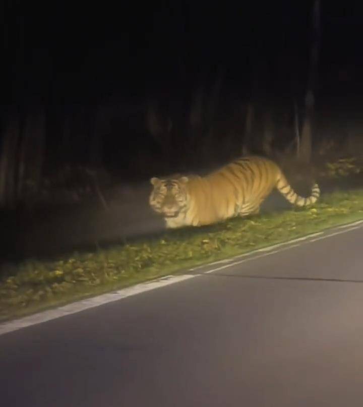 10月18日,有网友发视频称,他在吉林省延边朝鲜族自治州二道白河镇的G331国道附近自驾时,遇到了一只体型较大的野生东北虎,并与其对视5秒左右,随后老虎走下路沿消失在了林间。