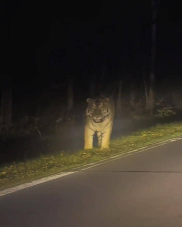 据视频画面显示,视频拍摄者在夜间自驾时,车灯照射到了路边的一只野生东北虎,老虎起初准备跳下公路躲避,没想到开车的男子喊了一句:“本地的,大哥!”老虎疑似被声音吸引又走上公路并与男子对望了约5秒。视频中可以清晰地看到,这只野生东北虎体格壮硕,观望了一会后便缓步转身消失在了夜色中。