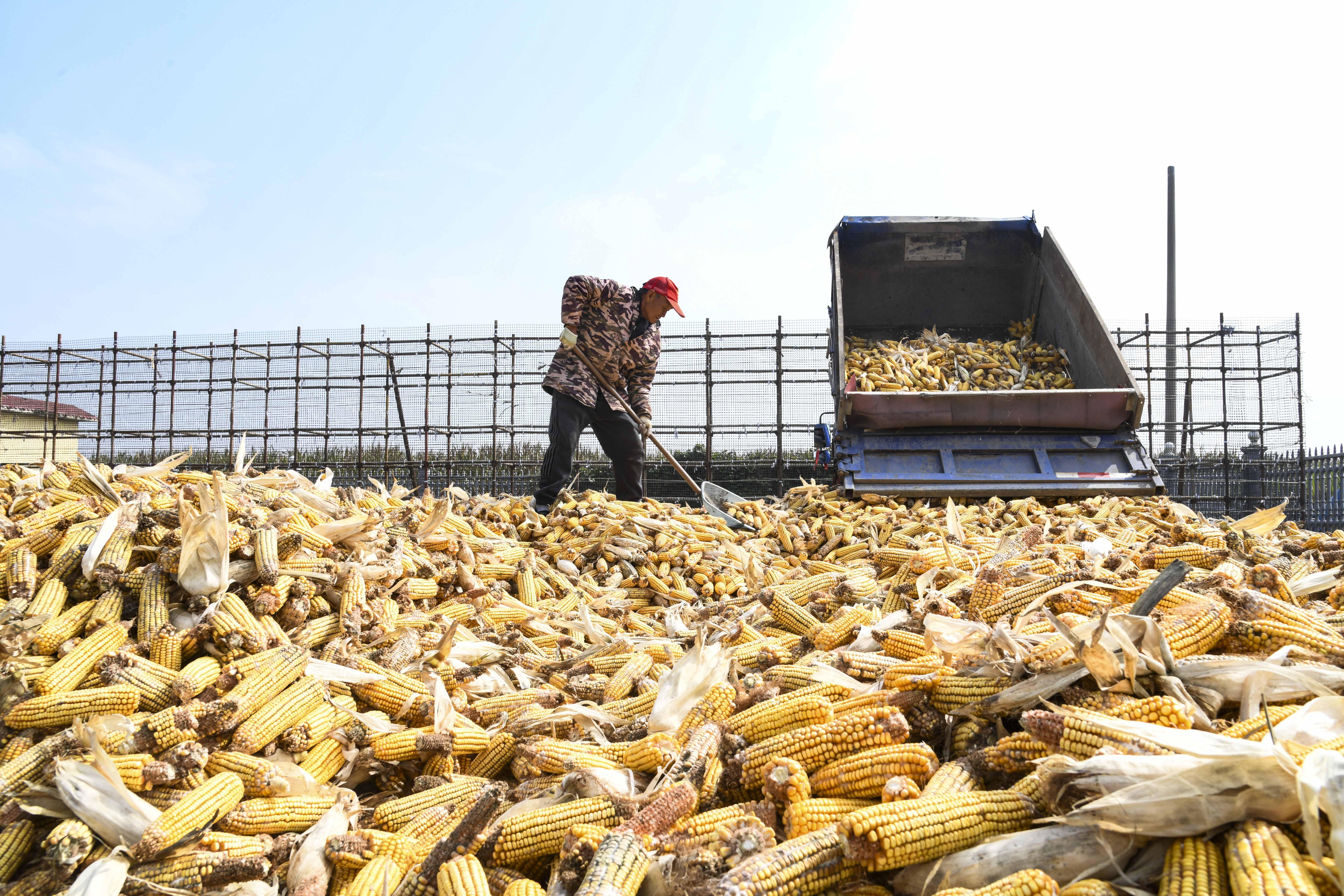 10月14日,河南省济源市五龙口镇农民晾晒刚收获的玉米。新华社发(苗秋闹摄)
