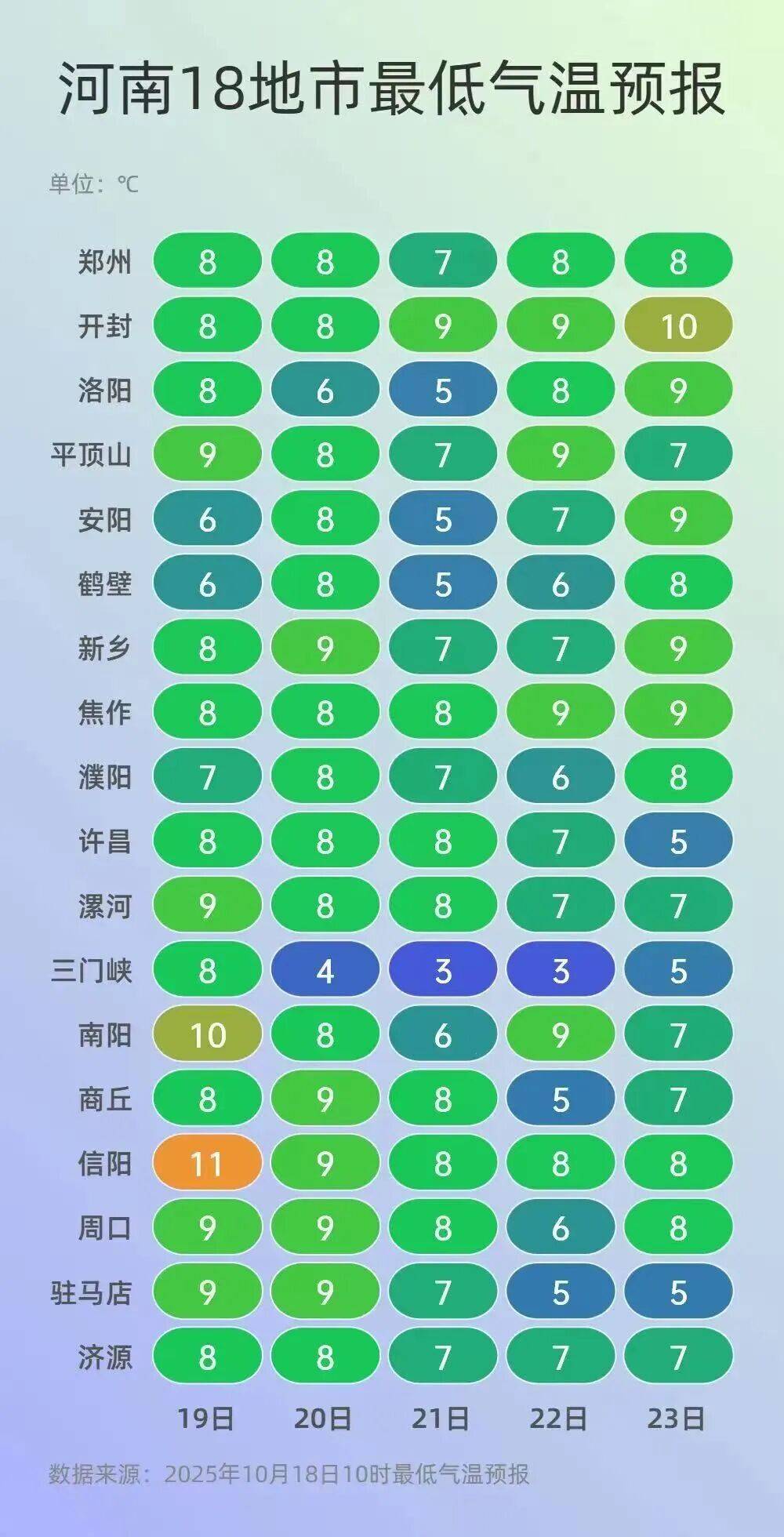 冷空气持续影响,今天到20日,气温较前期下降8℃左右,20日全省大部最高气温仅有10℃出头西部部分地区甚至不足10℃。最低气温将逐渐跌至谷底,仅有5-7℃,多地将迎今年下半年来最冷早晨。20日凌晨西部山区还将出现初霜冻