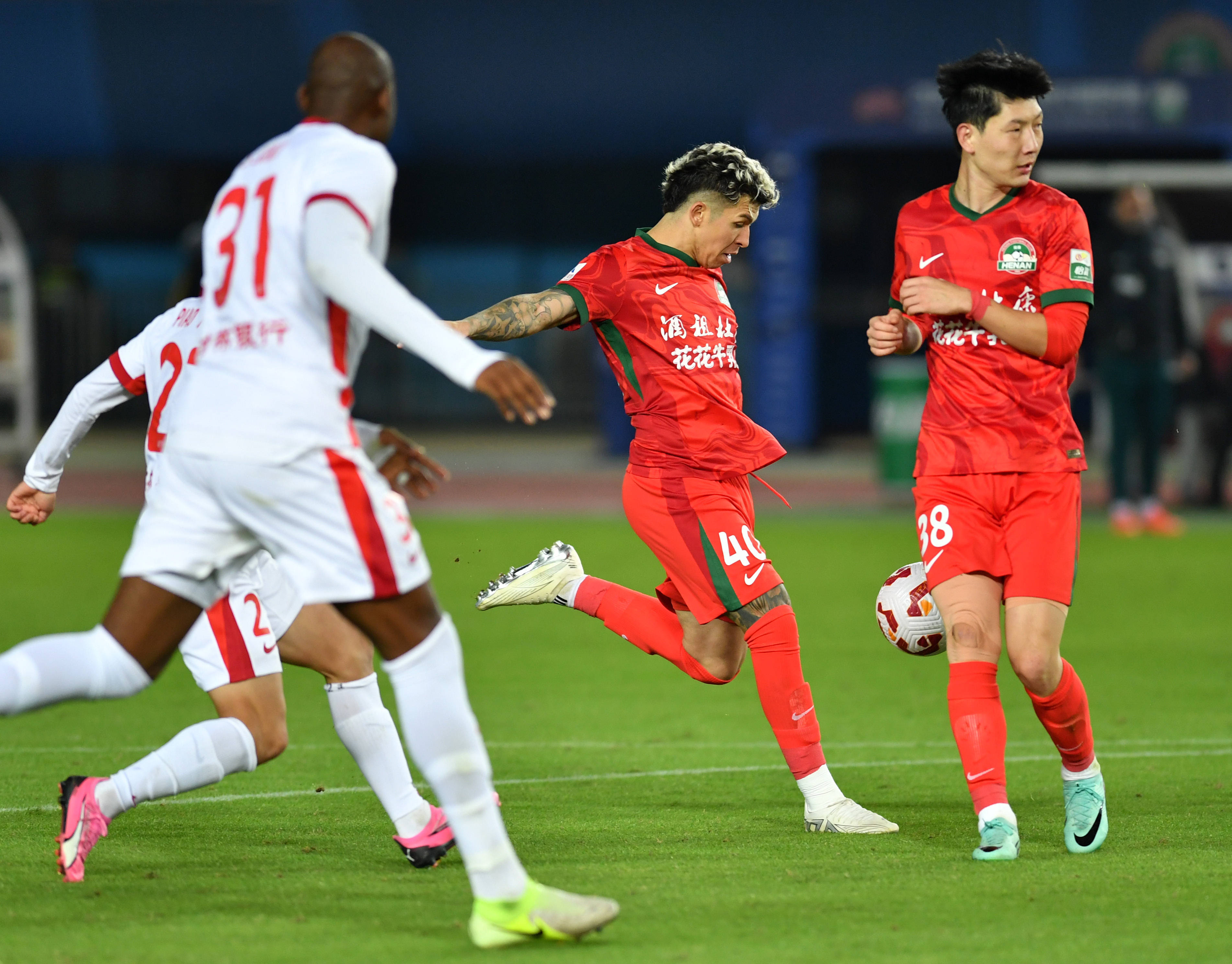 10月19日,河南俱乐部酒祖杜康队球员纳萨里奥(中)射门得分。 新华社记者 李嘉南 摄