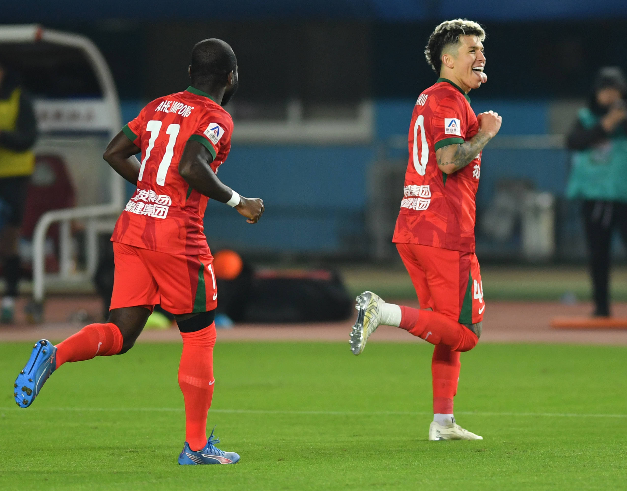 10月19日,河南俱乐部酒祖杜康队球员纳萨里奥(右)庆祝进球。 新华社记者 李嘉南 摄