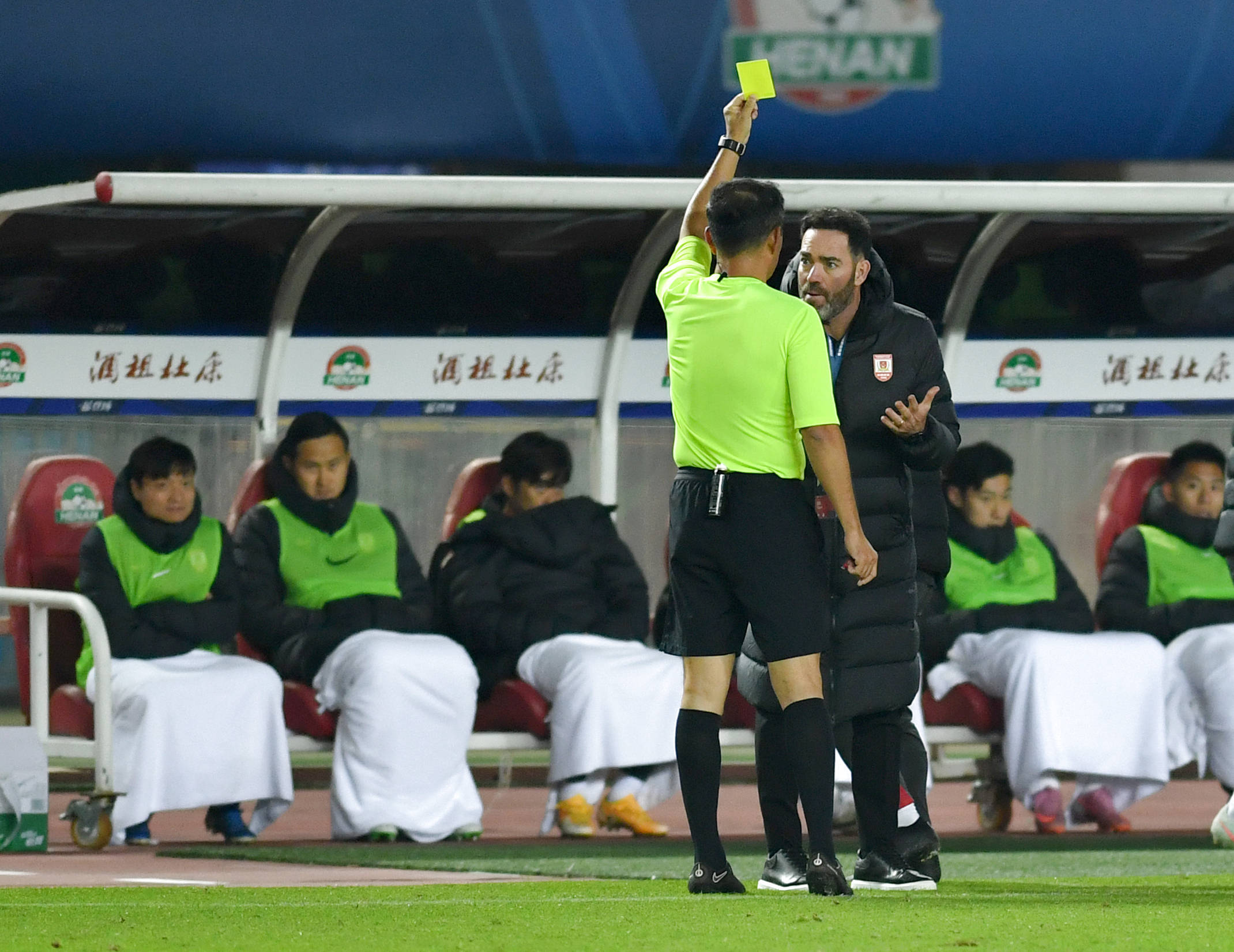 10月19日,主裁判刘威(前)向长春亚泰队主教练苏亚雷斯出示黄牌。 新华社记者 李嘉南 摄