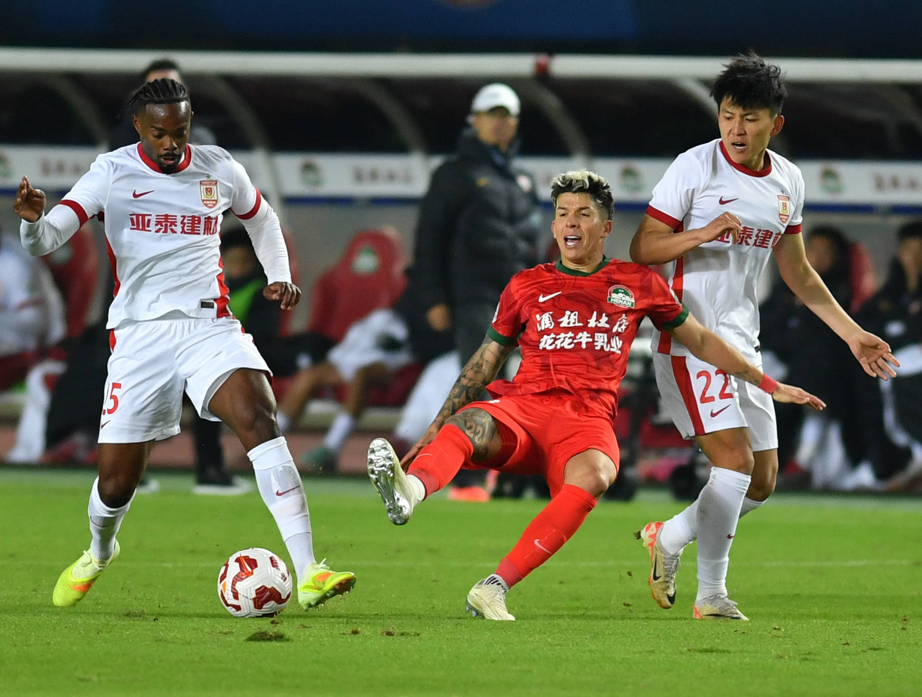 10月19日,长春亚泰队球员西普里安(左)与河南俱乐部酒祖杜康队球员纳萨里奥(中)拼抢。 新华社记者 李嘉南 摄