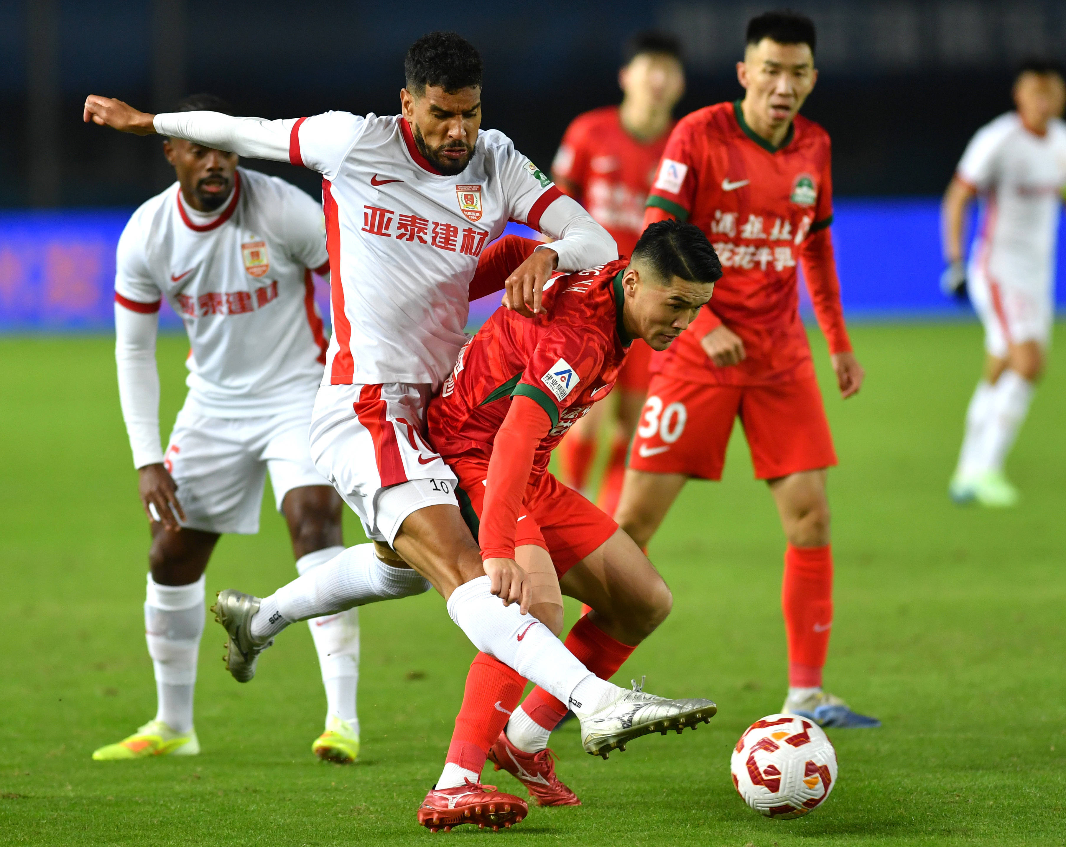 10月19日,长春亚泰队球员奥莫伊胡安弗(前左)与河南俱乐部酒祖杜康队球员钟义浩(前右)拼抢。 新华社记者 李嘉南 摄