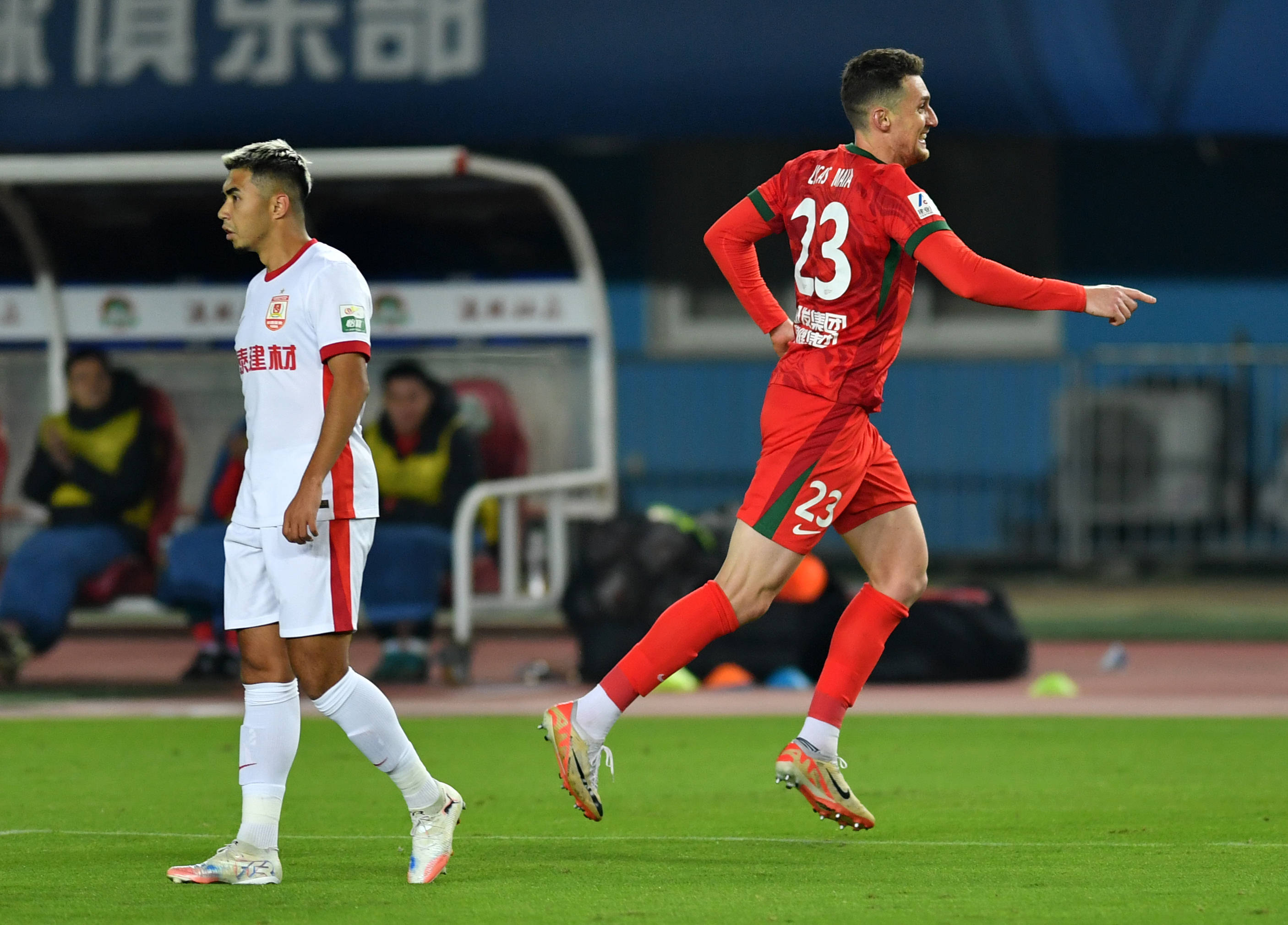 10月19日,河南俱乐部酒祖杜康队球员卢卡斯·马亚(右)庆祝进球。 新华社记者 李嘉南 摄