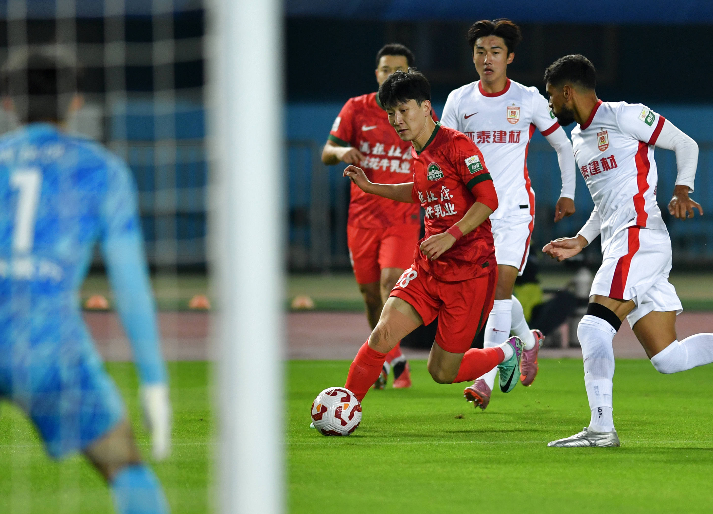 10月19日,河南俱乐部酒祖杜康队球员纳萨里奥(中)射门得分。 新华社记者 李嘉南 摄