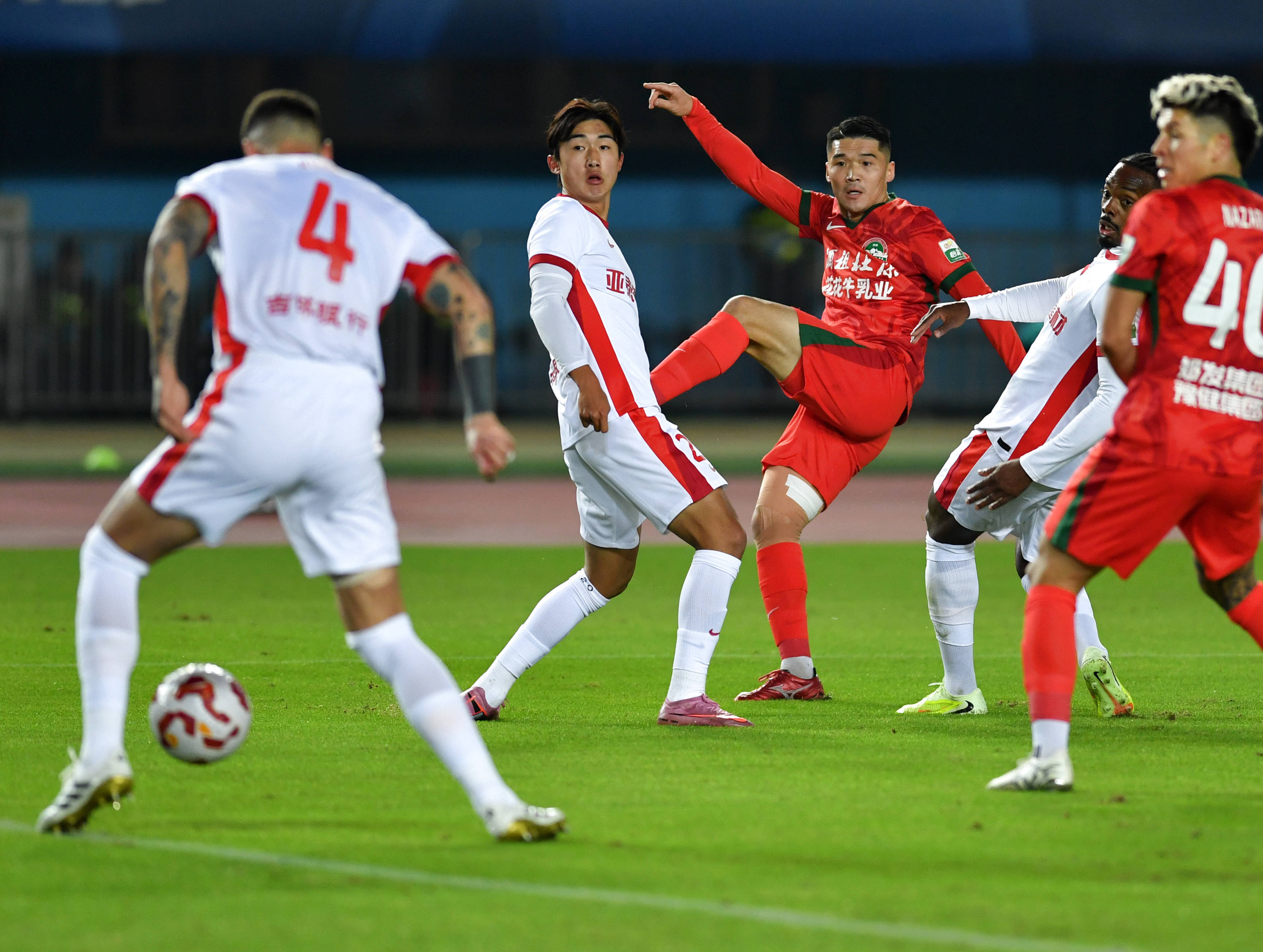 10月19日,河南俱乐部酒祖杜康队球员钟义浩(右三)在比赛中射门。 新华社记者 李嘉南 摄