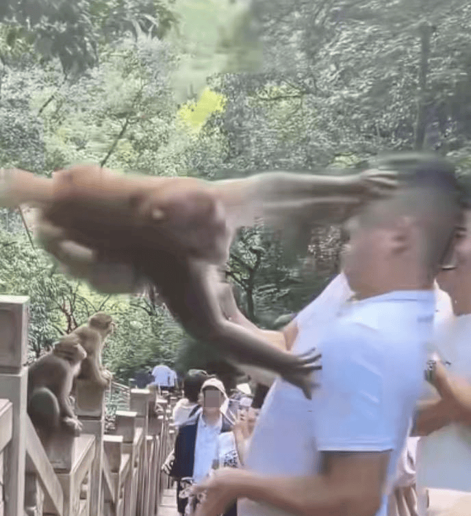 红星新闻记者获取的一段时长为5秒的现场视频显示,在游道边的石栏杆上,依次站着几只看似成年的猕猴。此时,一名身着白色短袖T恤衫的男子突然上前,伸出左手在一只猕猴的脸颊上轻轻扇了一下。男子的行为引发该猕猴激烈反应,猕猴迅速对男子进行还击。慢放视频后可以看出,猕猴先是用双上肢击打男子头部,接着用双下肢在男子胸口狠狠地踹了一下。