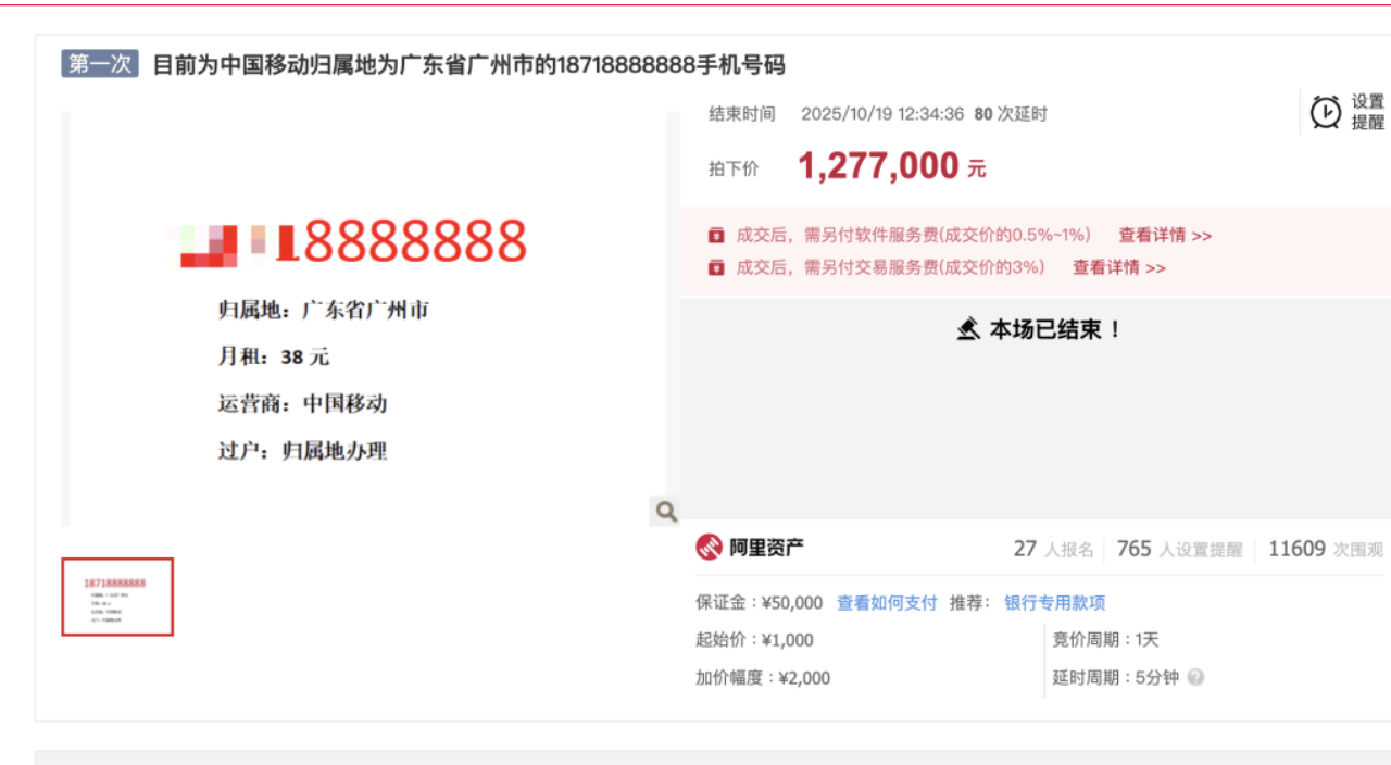 红星资本局10月19日消息,今日中午,一个尾号为“8888888”的手机号码在阿里资产平台被成功拍卖,成交价为127万余元。