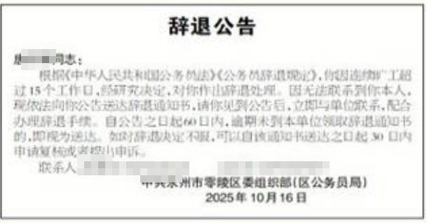 10月17日,永州零陵区委组织部在当地媒体发布《辞退公告》:唐某某同志,根据《公务员法》《公务员辞退规定》,你因连续旷工超过15个工作日,经研究决定,对你作出辞退处理。