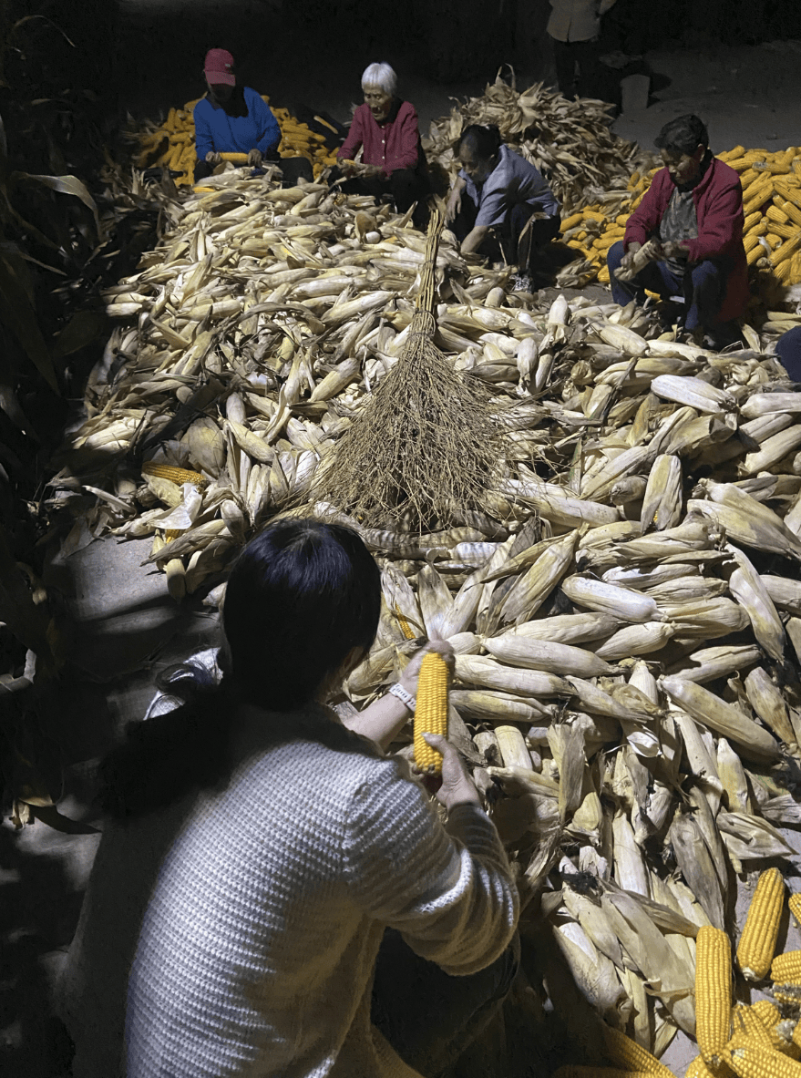 掰玉米和晒玉米同样是个大工程。掰玉米的情景是一个值得研究的社会现象:一大堆玉米往往摆在自家大院子里,一家人围着玉米坐下一边掰玉米,一边聊天,这是一项肌肉记忆的工作,无需专注。有意思的是,当其他人透过门缝看到你家正在掰玉米,便会自动拿个凳子加入其中,无缝融入掰玉米及聊天氛围里。于是,掰玉米的环会无限扩大,人越来越多,不只是同姓家族,村里其他姓氏的人——不管年龄、性别、关系好坏,都可以自动加入这个庞大的环。而参与者也并不会讨要自己的计件工资,这是一项传承已久的自然而然的行为,且只会出现在掰玉米这个流程中。
