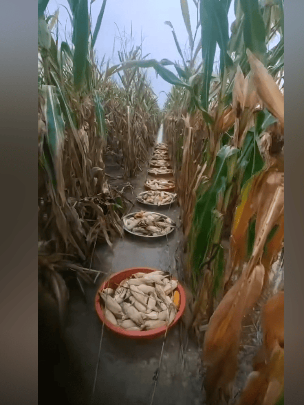 于是,习惯了旱作的北方农民,穿上连体雨衣和大长雨靴,趁着不下雨的日子,拿起锄头,穿上长袖长裤,带上草帽,早早地走进泥泞的土地里,依次完成摘玉米、砍玉米梗、运玉米、掰玉米、晒玉米、脱粒等一系列工作。有些雨势大的地方,甚至出现了一个吊诡的情景:直接在地里给玉米“坐上船”,用大盆一盆一盆地装玉米,然后漂流到“岸上”。