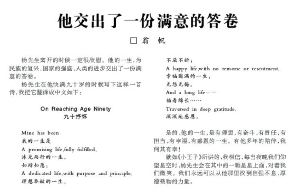 文末,她借《小王子》的意象寄托绵长思念——每当人们仰望星空,杨先生必在某一颗星辰上微笑俯视人间。他那“自强不息、厚德载物”的精神力量,将如星光般永恒,继续照亮后人的道路。这段文字不仅是一位妻子对丈夫的追思,更让公众看到了一个跨越世纪的生命如何将个人理想与家国天下融为一体,最终心无遗憾、福寿全归。