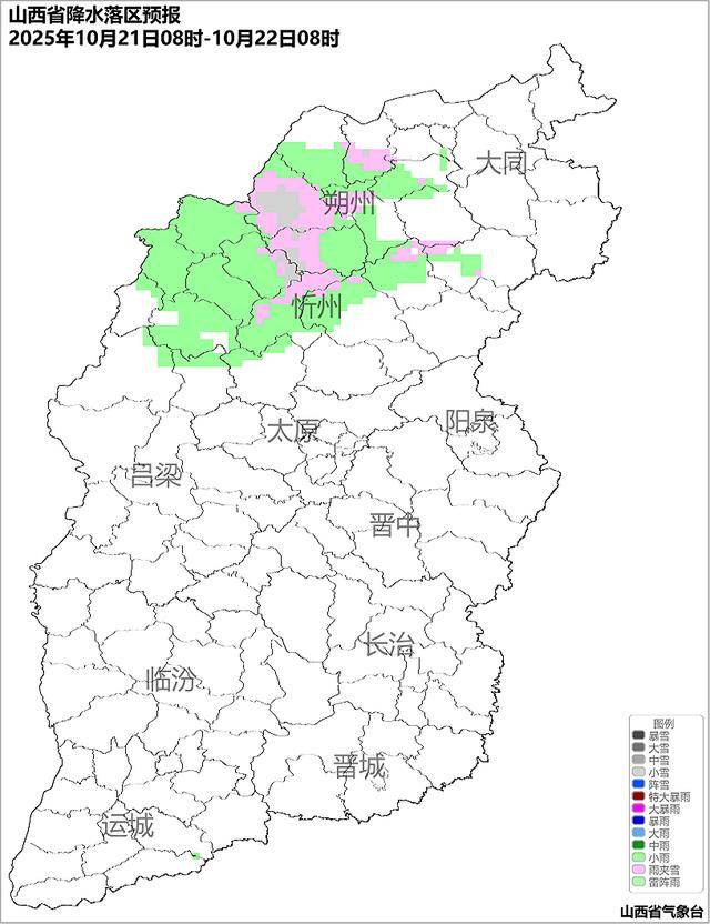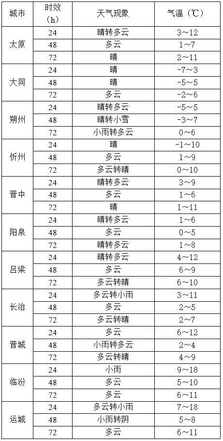 北中部多云转阴天,南部阴天间多云;忻州、吕梁、运城、临汾、晋城等地的部分和朔州、太原等地的局部地区有阵雨或小雨,北部山区有雨夹雪或小雪。
