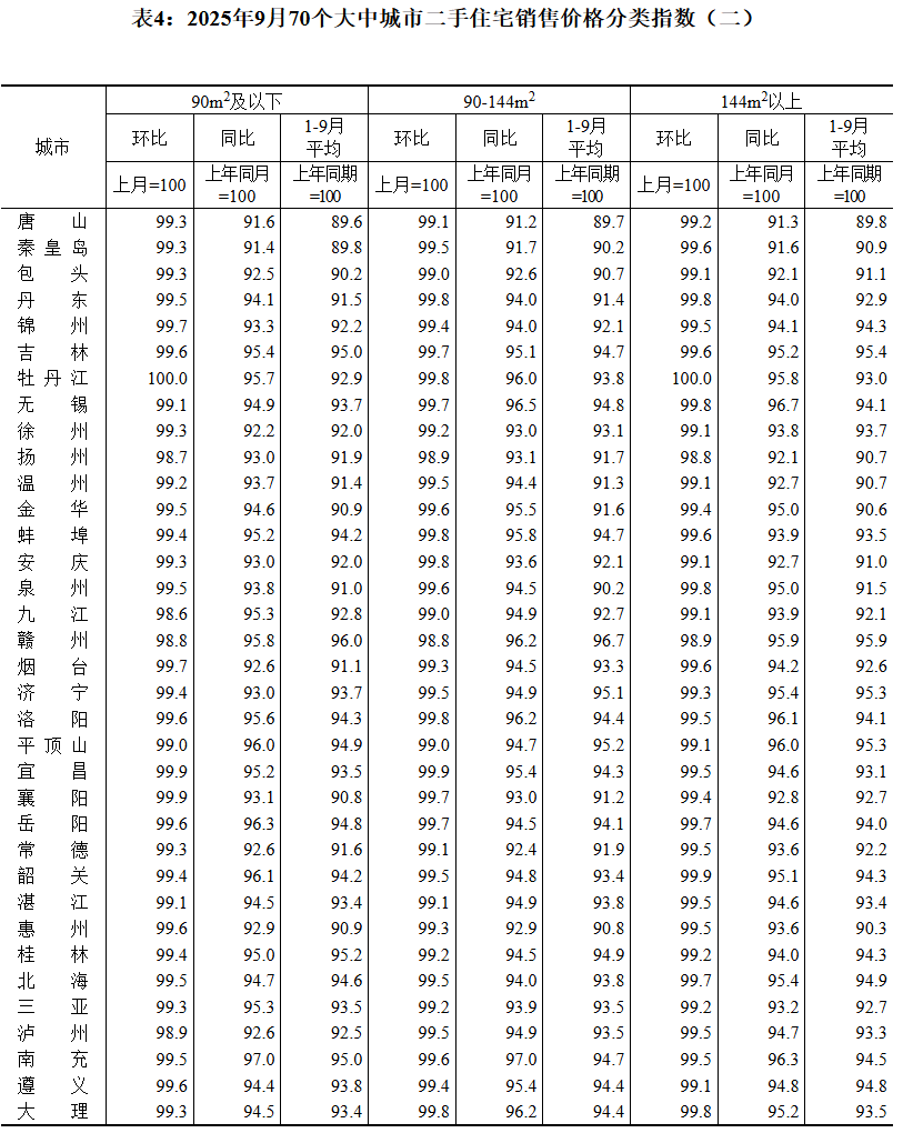 国家统计局数据显示,9月份,一线城市二手住宅销售价格环比下降1.0%,降幅与上月相同。其中,北京、上海、广州和深圳分别下降0.9%、1.0%、0.8%和1.0%。二、三线城市二手住宅销售价格环比分别下降0.7%和0.6%,降幅均扩大0.1个百分点。