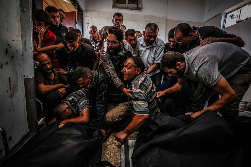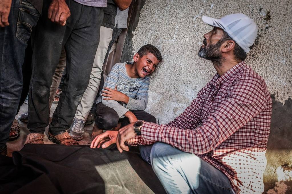 10月19日,加沙地带代尔巴拉赫,以色列空袭后,当地民众哀悼遇难亲属。