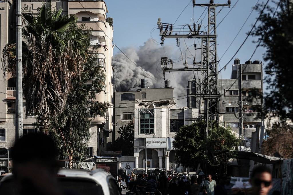 10月19日,加沙地带汗尤尼斯,以色列对加沙地带发动一系列袭击,汗尤尼斯东部地区上空升起浓烟。