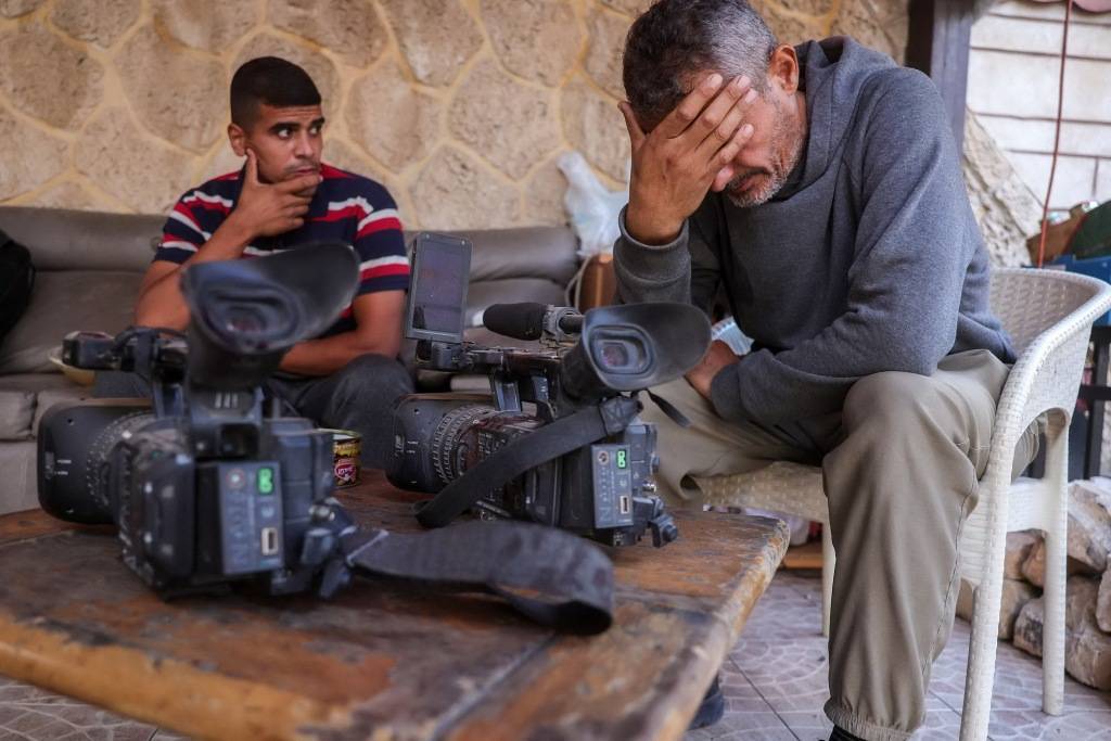 10月19日,加沙地带中部代尔拜拉赫扎瓦伊达市,媒体人员在以色列空袭后哀悼。此次空袭击中了记者使用的一所房屋,一名记者遇难。
