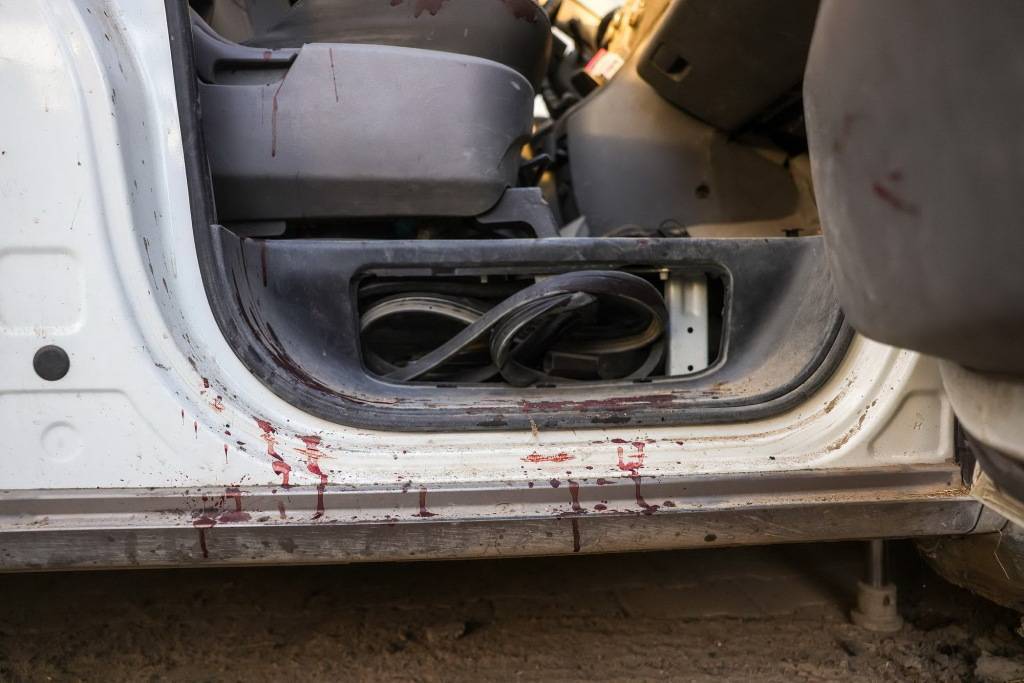 10月19日,加沙地带中部代尔拜拉赫扎瓦伊达市,在以色列空袭后,一辆受损车辆上的血迹。