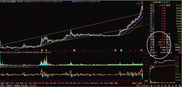 盘面看,42家银行股有涨有跌,西安银行以2.99%的幅度领涨银行板块。不过,最吸引注意的还是农业银行——该股不仅日K线连续拉出12根阳线,而且7.75元的收盘价令其一举收复了阔别十年之久的“每股净资产”(7.65元,动态)这一关口。当然,农行也是目前唯一一家收复了每股净资产的银行股。