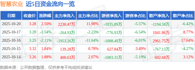 证券之星消息,截至2025年10月20日收盘,智慧农业(000816)报收于3.28元,上涨2.5%,换手率3.97%,成交量57.02万手,成交额1.86亿元。