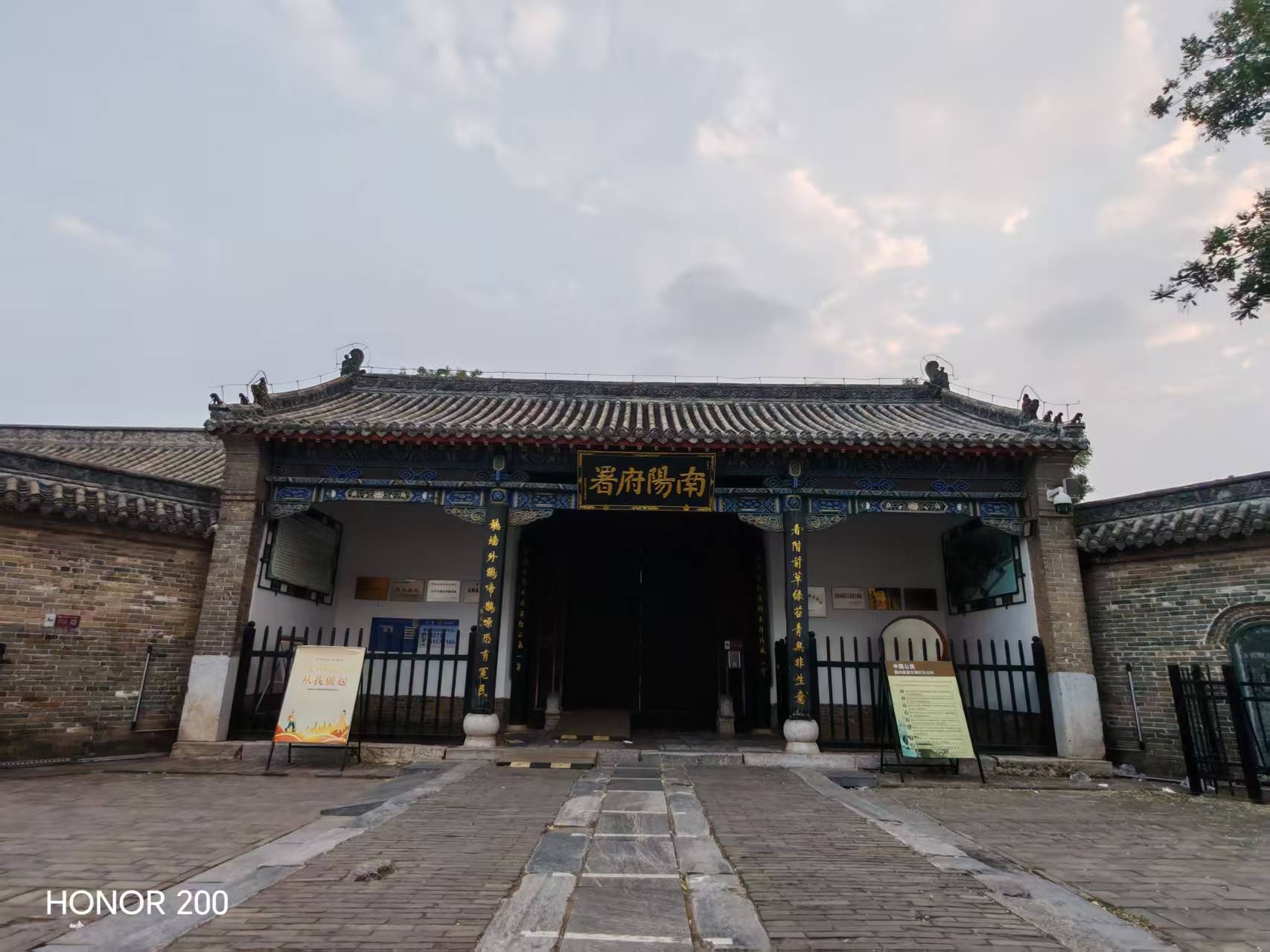 据《明史》记载:三至五品官府门用黑门锡环。南阳知府属正四品,府署大门是不会逾越规制的,为黑门锡环。大门明间前檐正中曾悬挂“南阳府”或“南阳府署”;大门又称“仪门”,位于府衙中轴线上的第一道门,是官员迎接圣旨、举行礼仪活动的场所,也是百姓申诉、递状的第一道门槛。典型的明清官式建筑风格,整体结构青砖灰瓦、朱漆立柱(檐柱、中柱均为圆形)、兽吻脊饰。檐下饰斗拱、设冤鼓、木笼等,门前石狮一对。