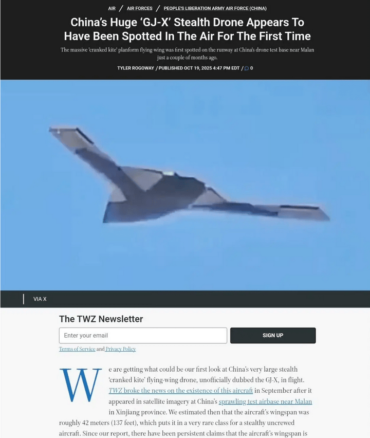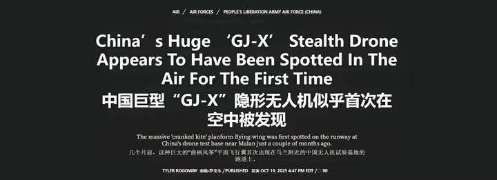 2025年10月19日,美国《战区》网站发布视频宣称,发现中国一款“巨大的无人机”正在试飞,其翼展据推测有42米左右(也有说43米),机体长度也有大约24米,堪称是全球已经试飞的无人机中最大的一款,其种种特性不仅刷新了人们对无人机的认知,还引发了“无人版轰-20”的猜测。