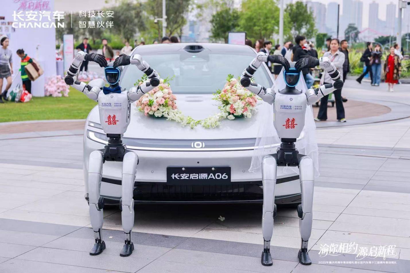 婚礼现场,科技与浪漫深度融合,温情与创新交织成景。由长安启源A06组成的“好运婚车队”巡游山城地标;巨型玫瑰与品牌IP莽灿灿气模亮眼登场,激发行人拍照打卡的热情;机器狗与机器人化身“赛博花童团”,以萌趣互动掀起阵阵欢笑;当夜幕降临,千架无人机编队在嘉陵江上空点亮“幸福启源”光影画卷,为整场婚礼写下科技与浪漫的完美注脚,展现出新央企新启源的创新表达与人文关怀。