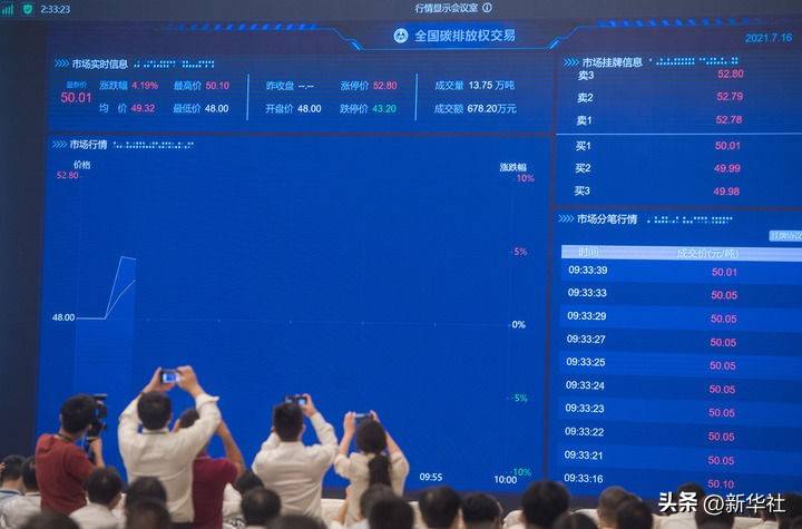 2021年7月16日在湖北武汉拍摄的全国碳排放权交易实时信息画面。新华社记者 肖艺九 摄