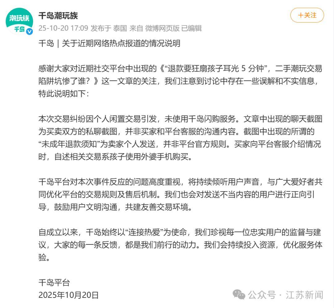 日前,“潮玩平台退款要求扇孩子耳光5分钟”的话题登上热搜,引发关注。