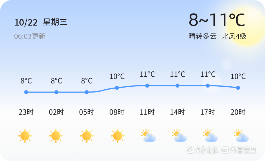 今天是10月22日,星期三,农历九月初二。烟台市天气晴转多云,北风4级,气温在8℃到11℃之间。目前温度为9.5℃,空气湿度为43%,空气质量良好,PM2.5浓度为26,属于优级。市民出行时建议根据气温变化适时增减衣物,注意保暖。