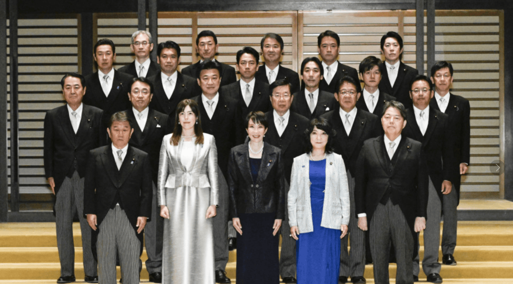高市早苗在9月自民党总裁选举中的4名主要竞争对手全部被委以重任。前农林水产大臣小泉进次郎出任防卫大臣、前官方长官林芳正出任总务大臣、自民党前干事长茂木敏充为外务大臣。前经济安保大臣小林鹰之则任自民党政调会长。