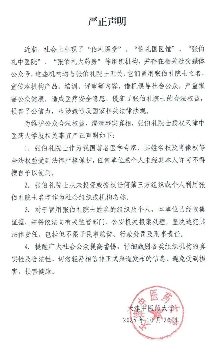 为维护公众合法权益,澄清事实真相,张伯礼院士授权天津中医药大学就相关事宜严正声明如下: