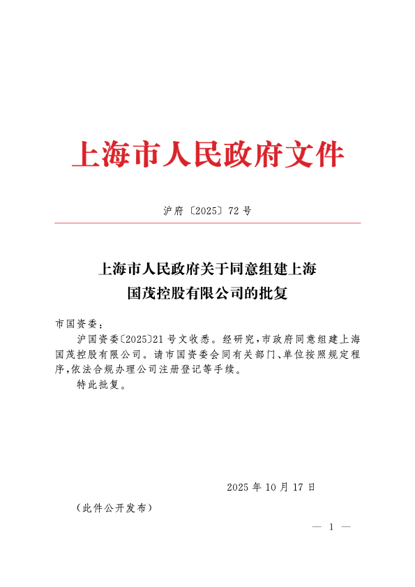 10月21日,上海市政府网站发布了关于同意组建上海国茂控股有限公司的批复。