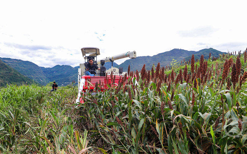 10月21日,在云阳县南溪镇天河村的高粱种植基地。当地农业部门统筹调配收割机与烘干设备,组织农户抓住雨停间隙,全力开展抢收。