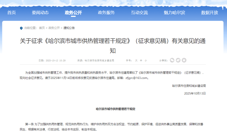 《哈尔滨市城市供热管理若干规定》(征求意见稿)向社会征求意见。图片来源/网站截图