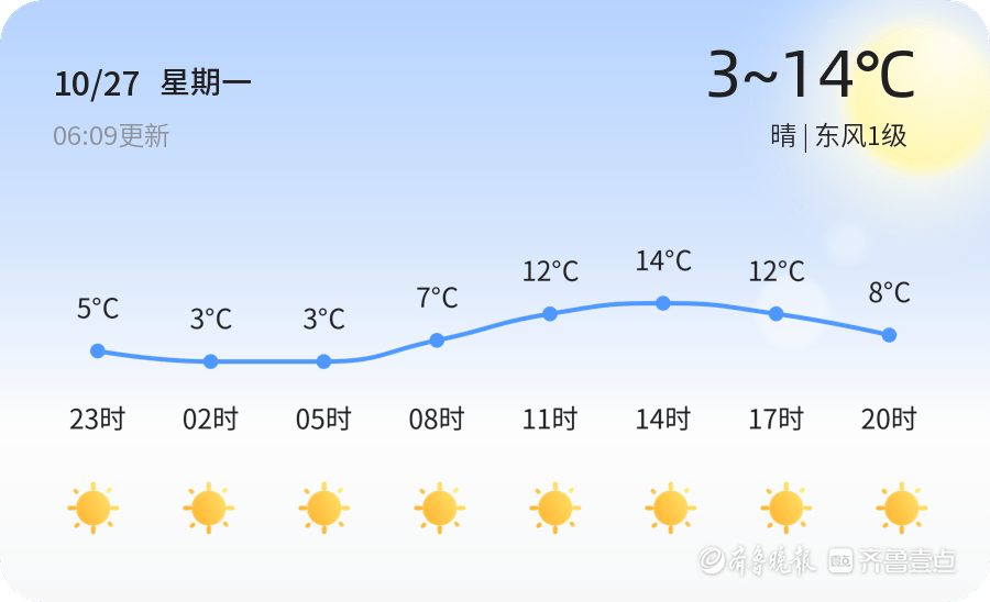 今天是10月27日,星期一,农历九月初七。德州市迎来晴朗天气,温度在3℃到14℃之间,东风1级,空气湿度97%,空气质量良好。各区天气情况一致,均为晴朗,适合市民户外活动。目前时间为6时09分,实时温度0.9℃,市民出行需注意保暖。