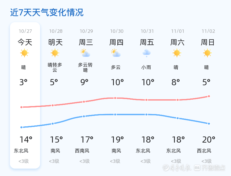 本周五(10月31日)将有小雨天气,提醒市民提前规划出行路线,避免因天气影响行程。雨天路面湿滑,驾驶车辆需减速慢行,保持车距,确保行车安全。其他时段天气晴朗,适合市民户外活动,但早晚温差较大,建议市民适时增减衣物,注意保暖。