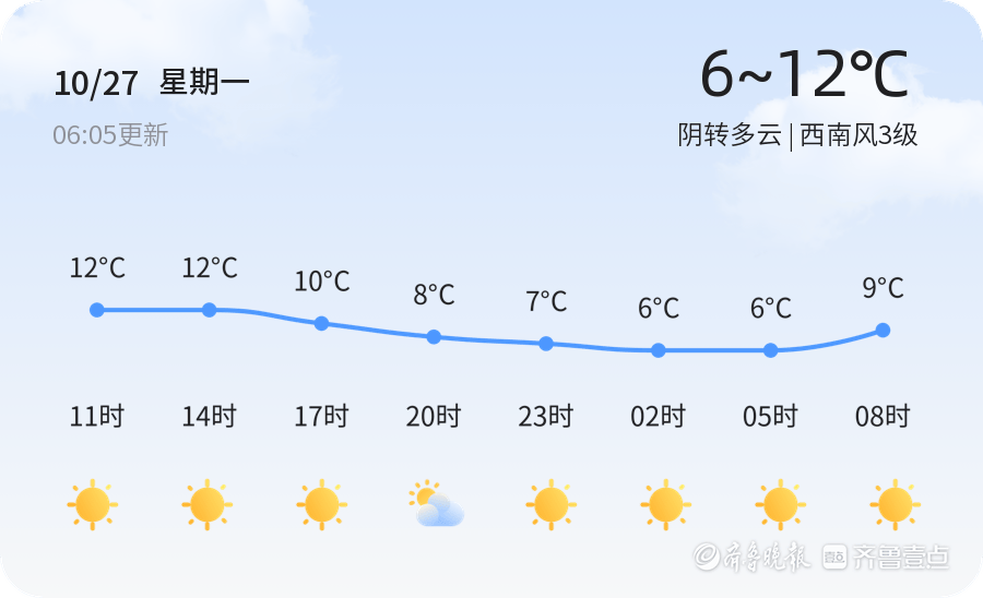 今天是10月27日,星期一,农历九月初七。威海市今日天气阴转多云,气温介于6℃至12℃之间,当前温度为8℃。风向为西南风3级,空气湿度为56%,PM2.5指数为20,空气质量状况为优。今日天气以阴转多云为主,市民出行时建议携带雨具,注意防范阴雨天气带来的路面湿滑。风力适中,整体天气条件较为适宜出行。空气质量优良,市民可以放心进行户外活动。