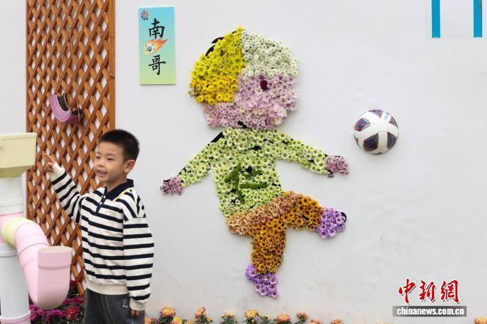 10月26日,南京农业大学湖熟菊花基地内,小朋友在菊花组成的“足球小将”处留影。中新社记者 泱波 摄