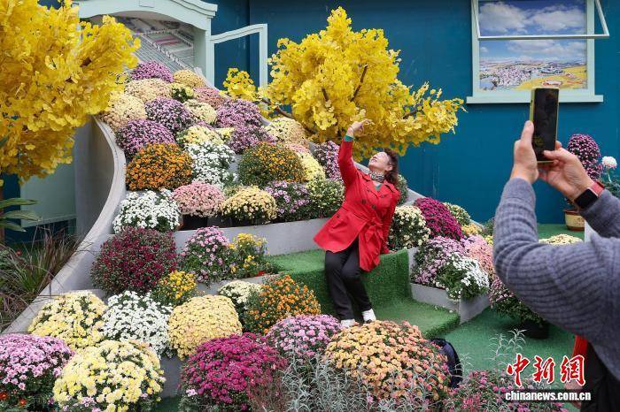 10月26日,南京农业大学湖熟菊花基地内,市民与菊花景观合影。中新社记者 泱波 摄