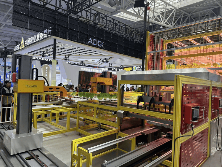 如果说虫情测报与智慧养猪是“点状突破”,那么无人化植物工厂则是一场“系统重构”。在展馆内,一套完整的自动化设备演示了从播种到采收的全流程:AGV传送带载着育苗盘穿梭,机械臂精准采摘成熟果实,所有设备通过一套集成的环境系统联动,实现了全程的无人化、智能化与自动化作业。