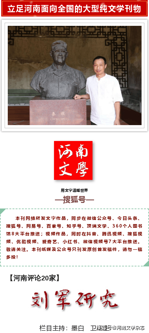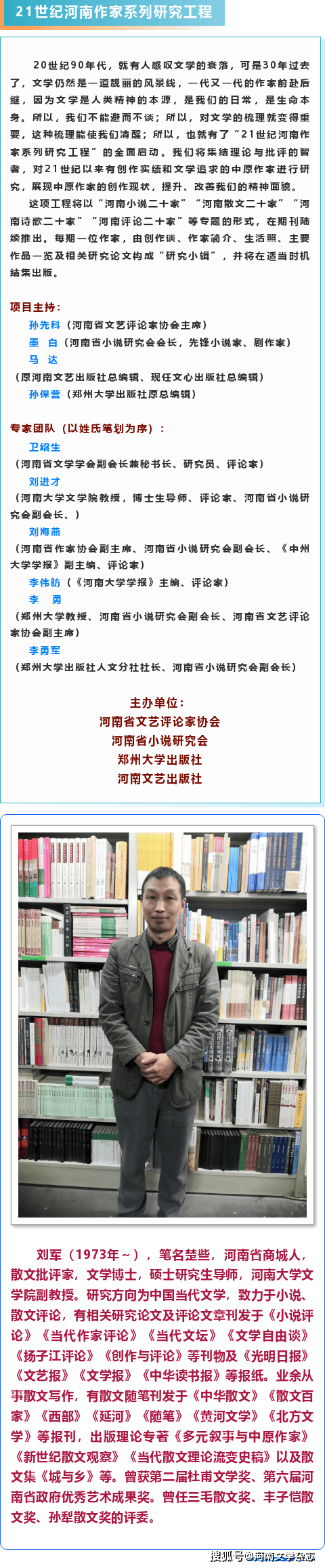 无论是在教学实践还是在批评写作中,刘军都一直保持着对文学的热情,在今天的学院人中,刘军不免显得有些另类,他在某种程度上传承了20世纪80年代那种有活力的批评风格,不仅大量阅读文学作品,还尽可能与所评论的作家保持着接触和传记经验式的理解。在他的每一篇批评文章中都尽力体现出这种风格,无论是对中原乡土叙事的研究,还是他一直追踪的当代散文批评,刘军都从对作品的阅读感受出发,对之进行携带着热情与主观性契机的阐释。